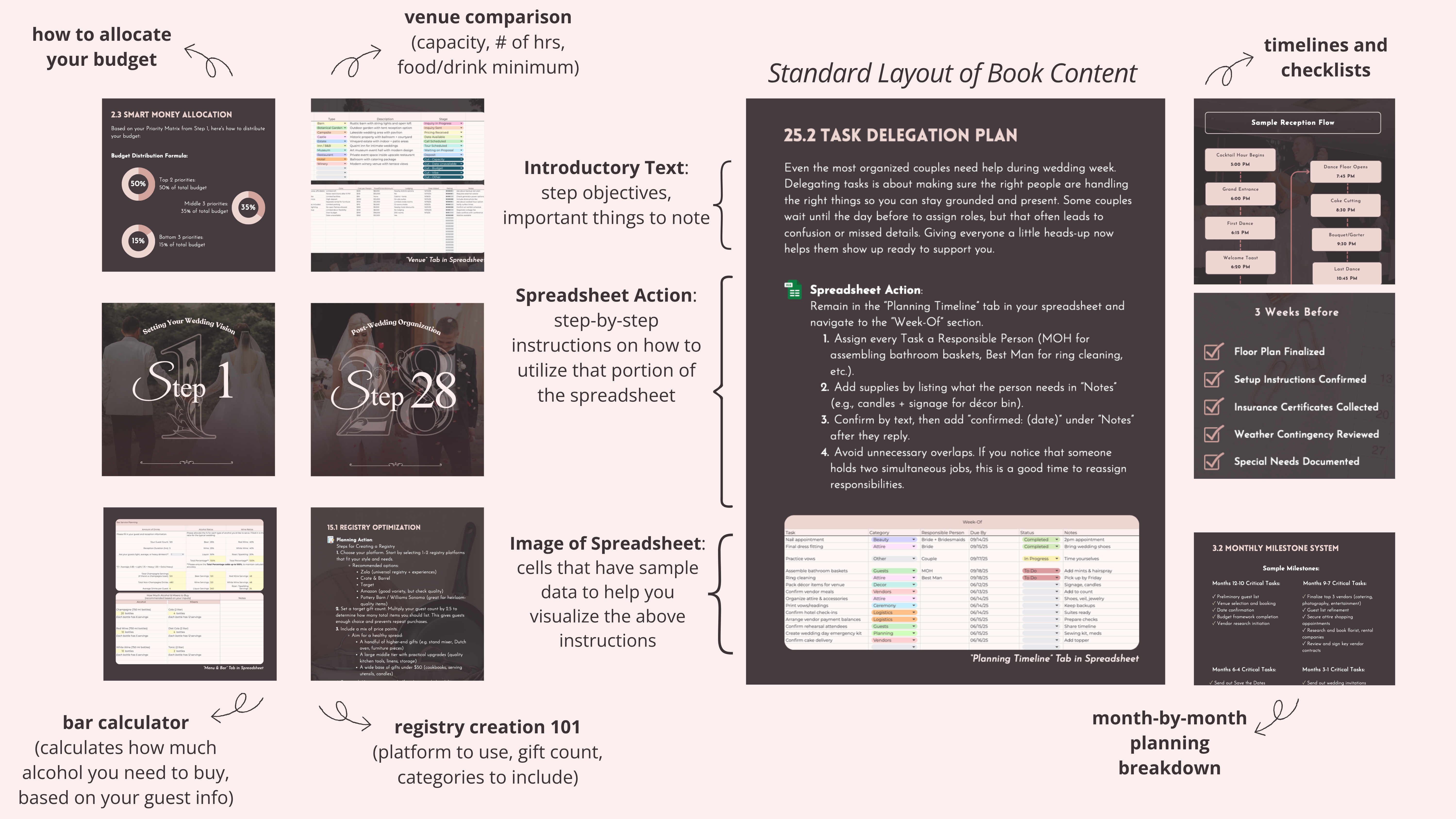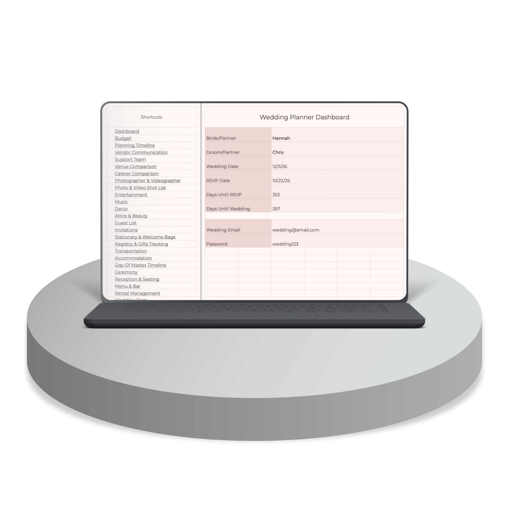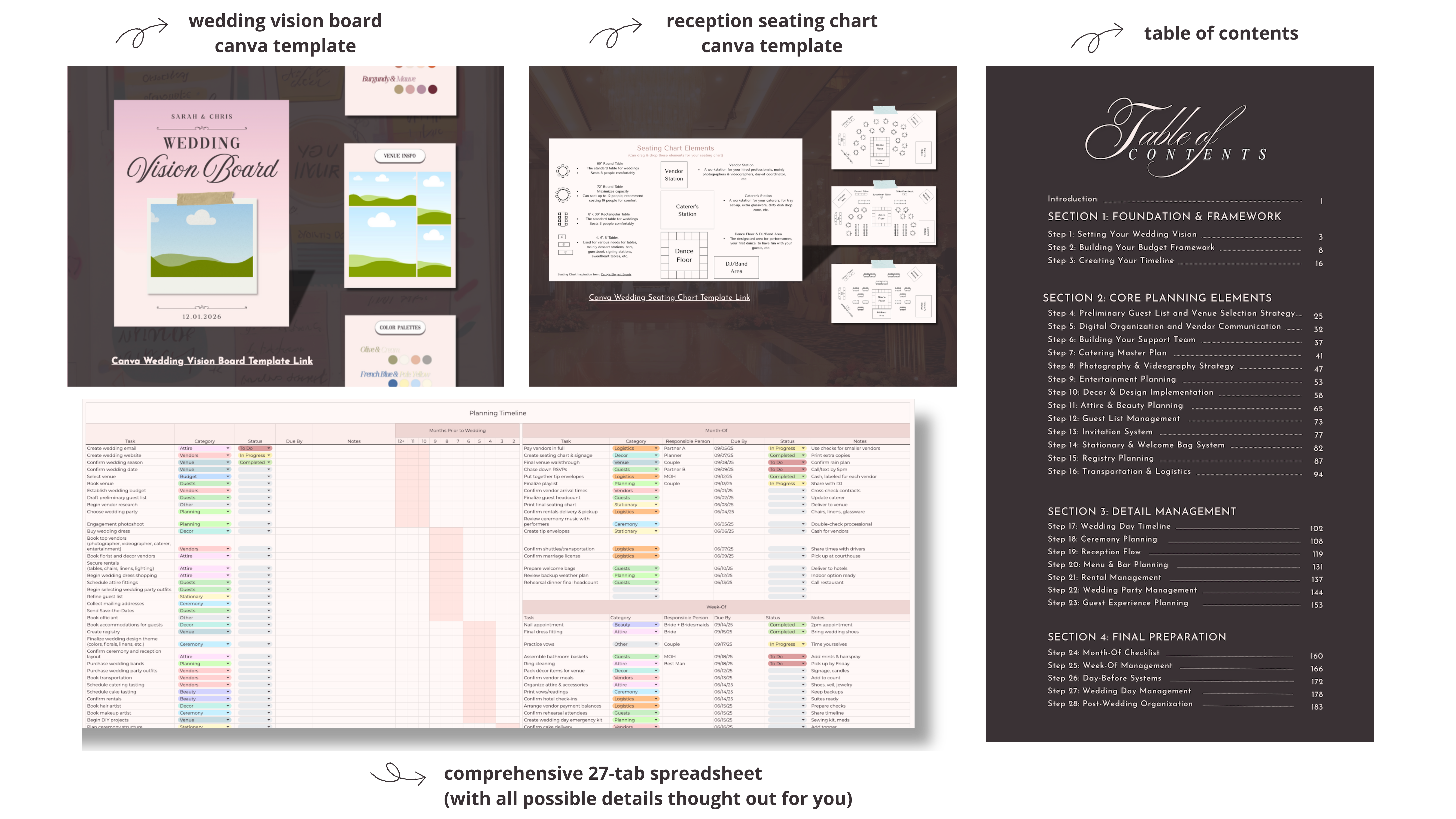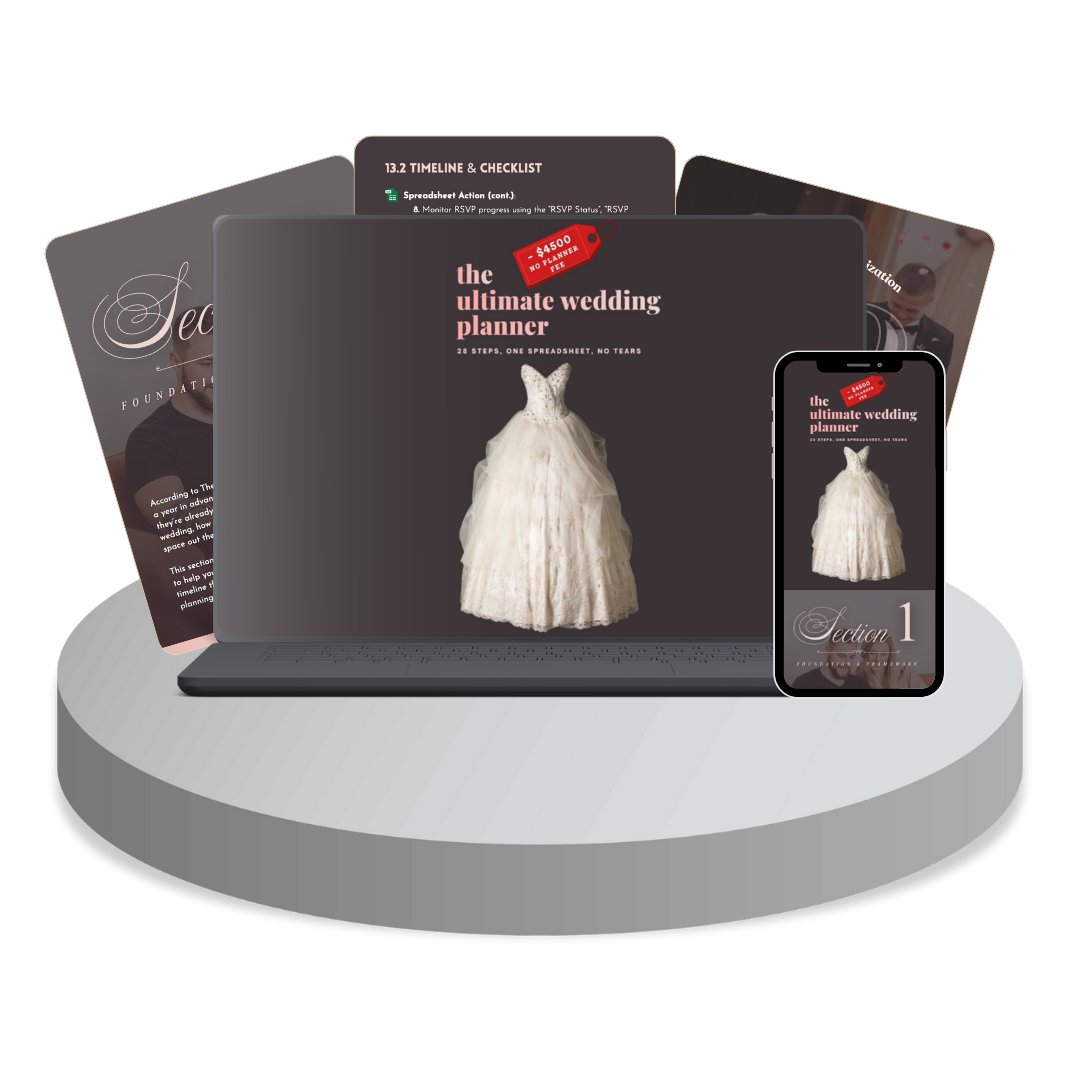 Stay completely organized and stress-free with our comprehensive wedding planning spreadsheet. This detailed spreadsheet that is used hand in hand with The Ultimate Wedding Planner breaks down every task, deadline, and milestone from engagement to the big day, ensuring nothing falls through the cracks.