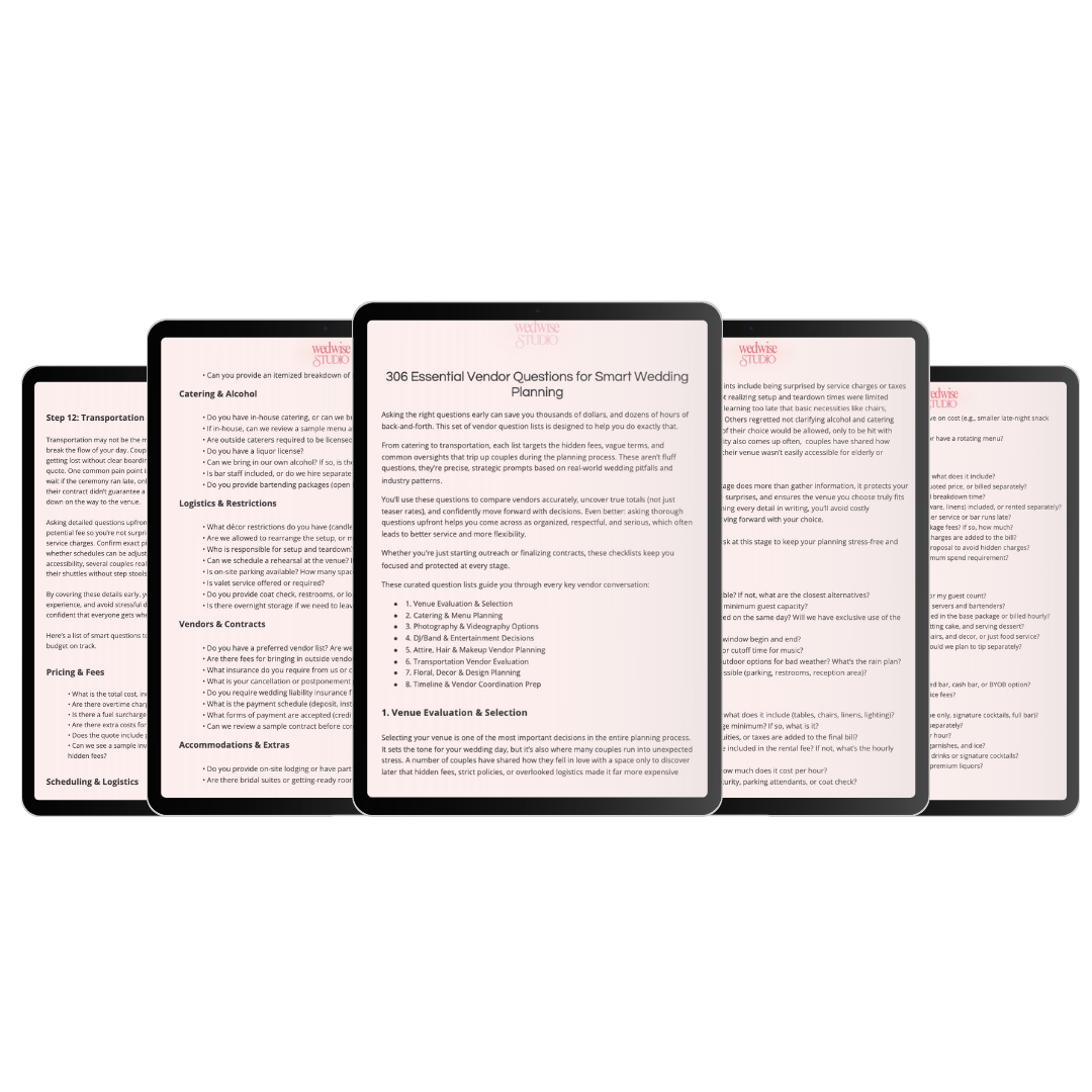 That’s why this system exists: a planner-level, fully comprehensive question guide designed to catch what couples usually miss… and reveal the details vendors don’t always mention upfront.